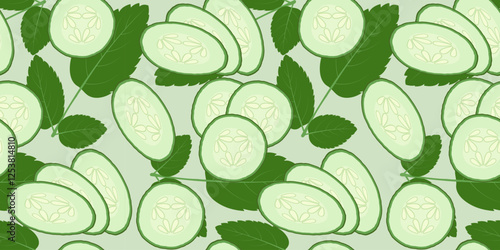 Naklejka premium Pattern with cucumber slices and mint sprigs