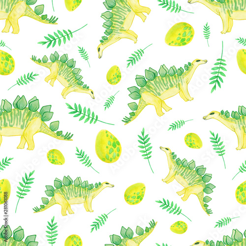 © Саша Рибицька, Naklejka premium pattern with watercolor dinosaurs. Green eggs reptiles and twigs