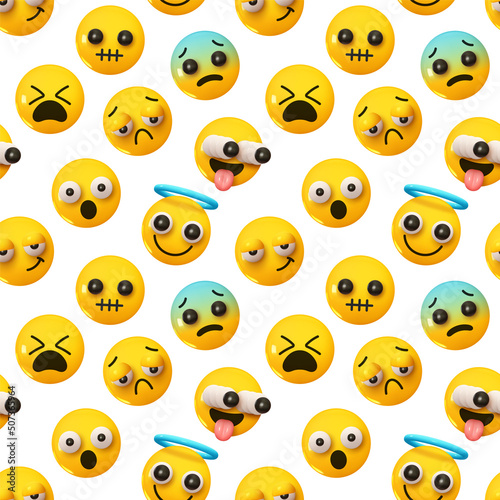 © lauritta, Fototapeta premium Pattern with yellow emoticons and emotions. Background with realistic 3d cartoon emoticons. Vector illustration