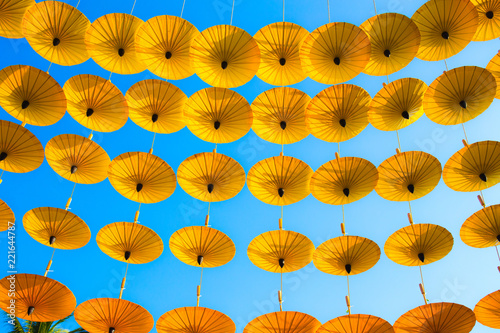 © thechatat, Naklejka premium Pattern Yellow umbrellas on blue sky.