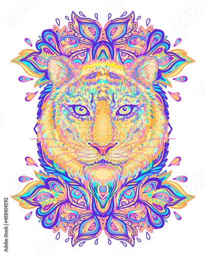 Fototapeta premium Patterned ornate tiger head. African, Indian, totem, tattoo, sticker design. Design of t-shirt, bag, postcard and posters. Vector isolated illustration in bright neon colors.