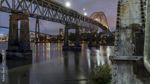 © Daniel Avram, Obraz premium Patullo Bridge, Surrey, British Columbia, Canada. Long exposure of the bridge over the water. Sky Train Bridge.