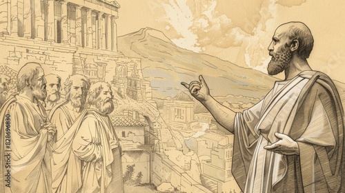 Fototapeta premium Paul Addressing Athenians at Mars Hill, Areopagus Listening, Biblical Illustration, Beige Background, Copyspace