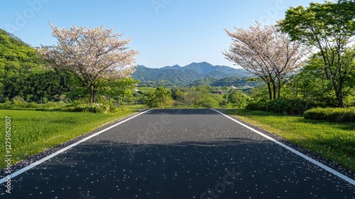 © TJ.Creative, Fototapeta premium Paved asphalt road stretching through a green landscape under a clear blue sky