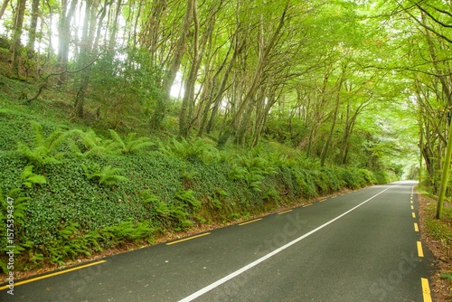 Fototapeta premium Paved forest road is winding through flat design tunnel with leafy arch and white center line