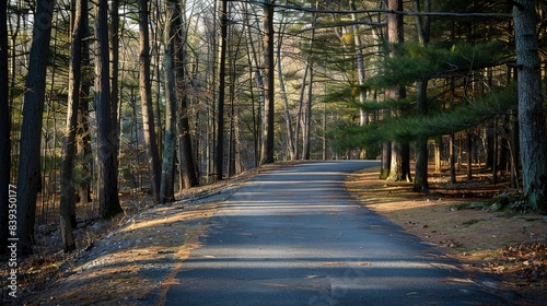 Obraz premium Paved trail in an empty forest, close-up, sunlight filtering through tall trees, tranquil and undisturbed, no people