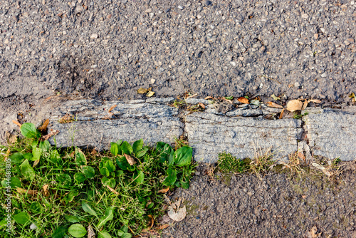 Obraz premium Pavement surface of a sidewalk with grass and a crossover to asphalt as urban...