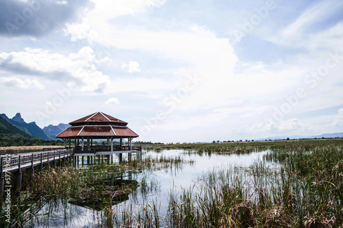 Fototapeta premium pavilion and wood bridge in swamp