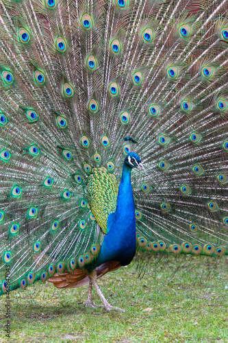 © Anna Korpak, Naklejka premium Paw z rozpostartym pięknym ogonem. Pawie pióra.