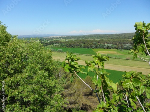 Obraz premium Paysage ciel bleu forêt toitures maisons terre vert champs