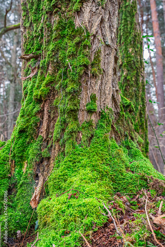 © ODIN Daniel, Naklejka premium Paysage de sous-bois dans une forêt en hiver avec des feuilles mortes et de la mousse vert sur les arbres.