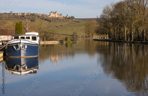 © jef 77, Fototapeta premium paysage le long du canal de Bourgogne, port de Vandenesse-en-auxois avec vue sur le village perché de Châteauneuf du département de la Côte-d'Or