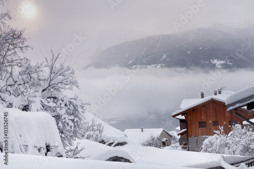 © coco, Naklejka premium paysage sous la neige et dans les nuages en montagne