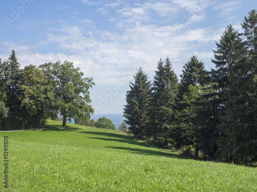 © Marc, Naklejka premium Paysages de Bavière. Vues sur les collines, prairies verdoyantes et pâturages autour du village de Hundham dans la vallée du Leitzach au pied du Schwarzenberg.