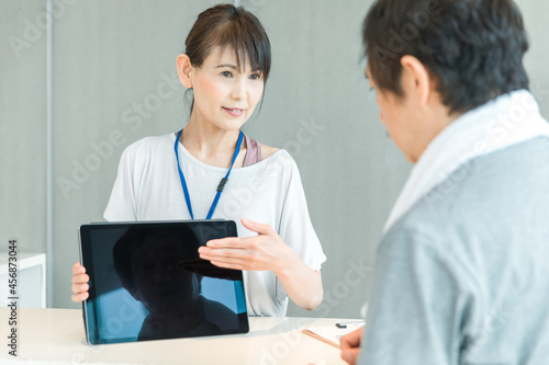 Fototapeta premium スポーツジムの受付をする女性(タブレットPC)