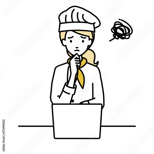Fototapeta premium デスクで座ってPCを開いて困っている調理師の女性