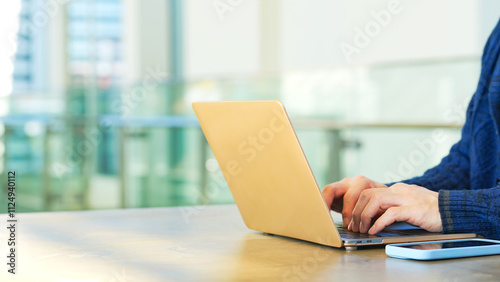 Fototapeta premium ノートパソコン、タイピング、PC、DX、デジタル、メール、エンジニア、システム、ソフトウェア、インターネット、検索、オンライン、web、作業、事務、プログラミング、プログラマー、大学、学生、スマホ、ビジネス、カジュアル、ノートPC、キーボード、テキスト、入力、仕事、オフィス、コピースペース、顔なし、手元、アップ、室内、ロビー、テクノロジー、トランスフォーメーション、副業、勉強、学習、eラーニング、