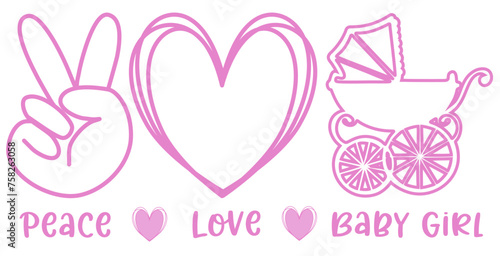 © roberta, Fototapeta premium Peace, love, baby boy - pram, strooler, heart, hand - pink color - newborn clothing - word - Birth vector graphics for greeting, accessories, baby shower,, sweatshirt, prints, cricut,, sublimation