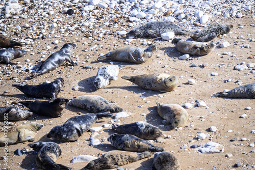 Fototapeta premium Peaceful Afternoon: Fur Seals Basking at Bempton Cliffs Beach