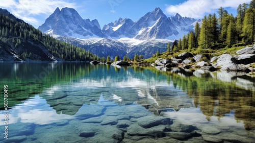 Naklejka premium Peaceful alpine lake with reflections of snowy peaks, clear blue water and crisp air,