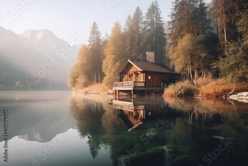 Naklejka premium Peaceful and calming lakeside retreat featuring a wooden house surrounded by...