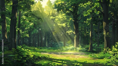 © 69, Fototapeta premium Peaceful anime style forest clearing, sunlit with lush greenery and dappled light, summer tranquility