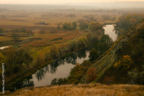 Fototapeta premium Peaceful autumn river valley seen from a high viewpoint