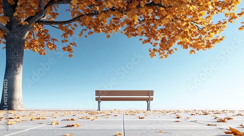 © Tam, Naklejka premium Peaceful Autumn Scene with Wooden Bench in Park