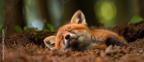 © Starkreal, Naklejka premium Peaceful Baby Fox Snoozing in Cozy Den - Adorable Wildlife Nap Time in Forest Habitat