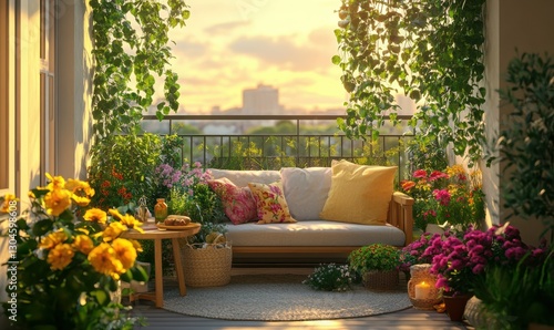 © Tanya, Fototapeta premium Peaceful balcony garden with lush greenery, cozy outdoor furniture, and vibrant flowers bathed in golden hour light