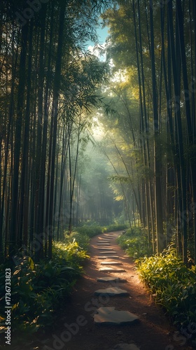 © MochamadArif, Obraz premium Peaceful Bamboo Forest in Soft Sunlight