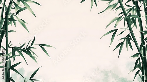 © Keattipoom, Fototapeta premium Peaceful Bamboo Frame Vector with Serene Grey Dawn Sky - Cartoon Style Flat Illustration in Hand-Drawn Watercolor, Tranquil Colors