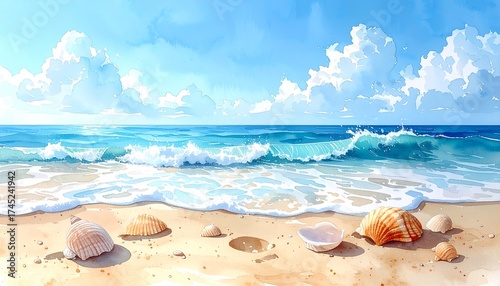 © digitalbysher, Obraz premium Peaceful Beach Shore with Gentle Ocean Waves in Watercolor Style