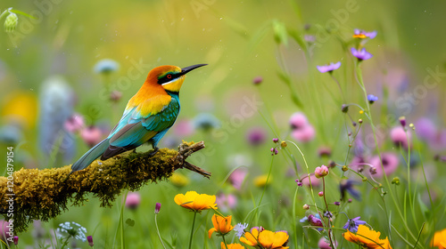 © usmangani, Fototapeta premium Peaceful Bee-Eater: Vibrant Green, Yellow, and Blue Plumage Against Tranquil Backdrop