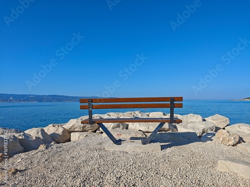 Obraz premium Peaceful bench overlooking calm waters at a coastal location on a bright,...
