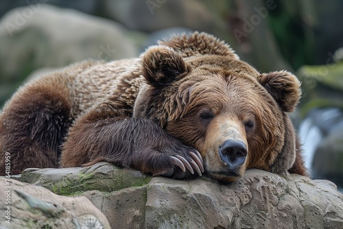Obraz premium Peaceful brown bear captured taking a moment of rest, its face a portrait of relaxation on a rock amid nature