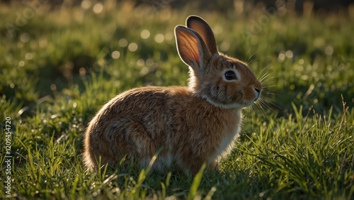 Fototapeta premium Peaceful Brown Rabbit Sitting in Green Grass Field Illuminated by Warm...