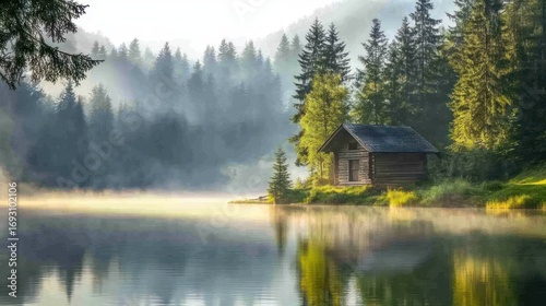 © Banyu, Fototapeta premium Peaceful cabin scene beside a misty lake surrounded by evergreen trees in the morning sun
