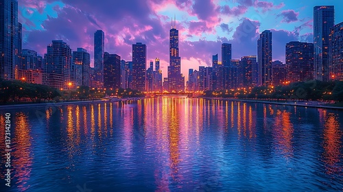 © Rikta, Fototapeta premium Peaceful chicago night scene with bright tower lights high resolution picture