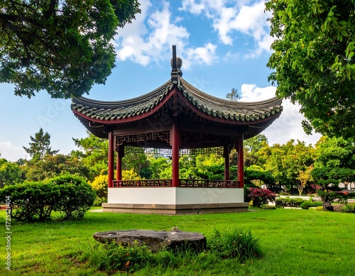 © SEH, Fototapeta premium Peaceful Chinese Garden Pavilion in Lush Landscape.