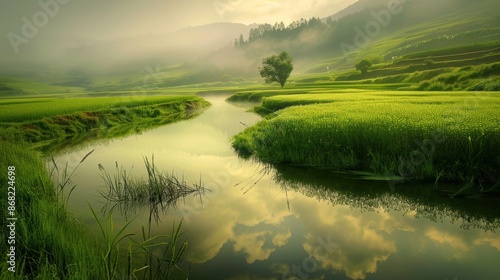Obraz premium Peaceful Countryside Landscape with Lush Fields, Rolling Hills, and Serene...