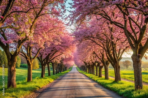 Naklejka premium Peaceful countryside road lined with flowering trees