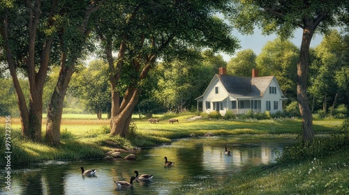 © AriyaniAI, Obraz premium Peaceful Countryside Scene with a White Farmhouse and Ducks