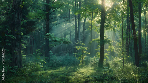 Naklejka premium Peaceful Dawn in a Serene Forest: Light and Shadow Dance Among Trees,...