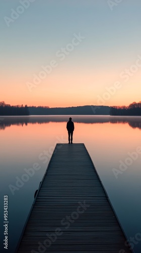 © Bendix, Naklejka premium Peaceful Determination: A Serene Figure at Sunset onTranquil Lake Dock