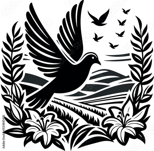 Obraz premium Peaceful dove soaring gracefully over a vibrant valley blooming with countless lilies