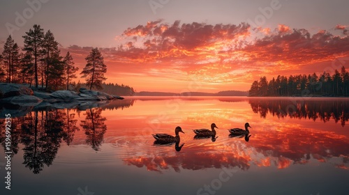 Naklejka premium Peaceful early evening on a lake with ducks swimming and colorful sunset sky...