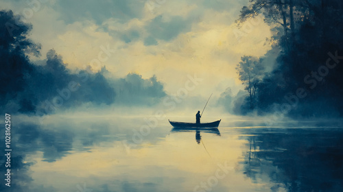 Fototapeta premium Peaceful fishing scene at misty lake dawn