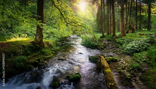 Obraz premium Peaceful forest creek winding through lush green vegetation, with soft light...
