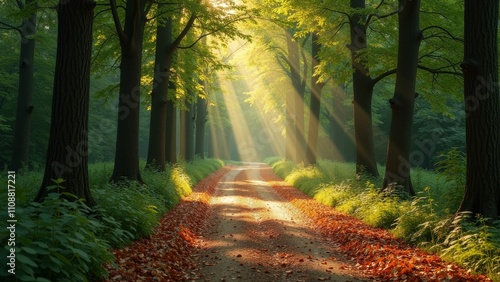 Obraz premium Peaceful forest path illuminated by dappled sunlight filtering through trees,...